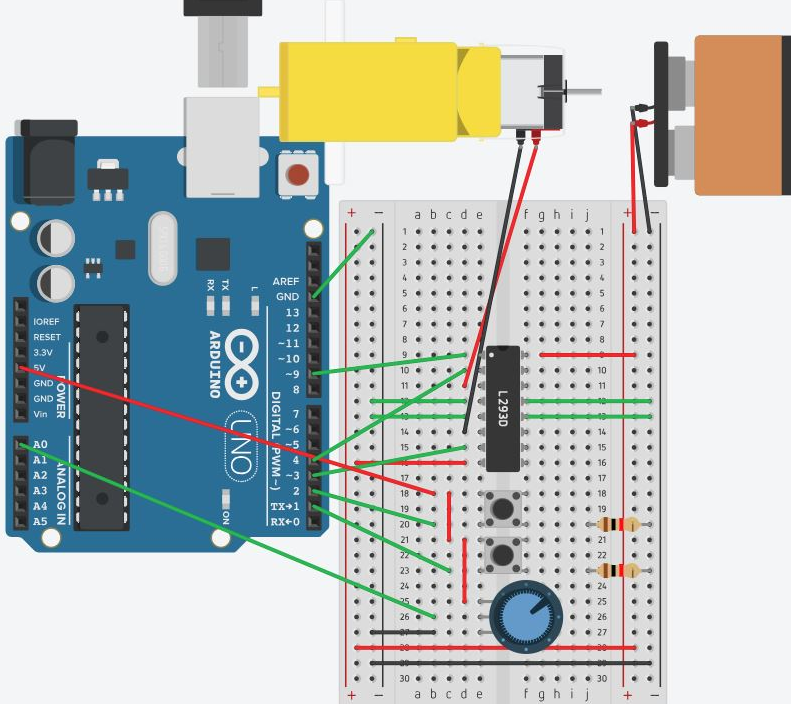 Nüüd kui skeemi üles laed, siis töötab mootor ühtepidi ja kui nupule vajutad, siis teistpidi. Täiendame seda veel ühe lülitusega, mis käivitab mootori ja potentsiomeetriga, mis muudab mootori kiirust.