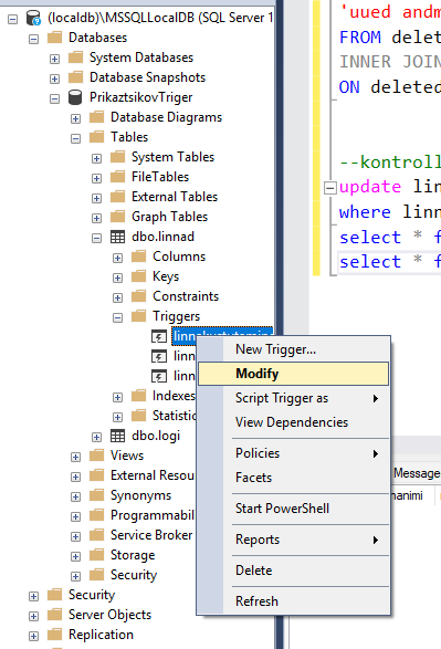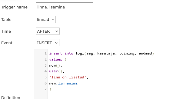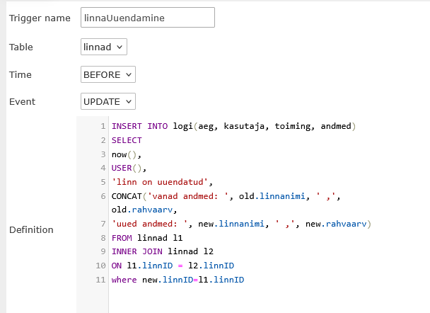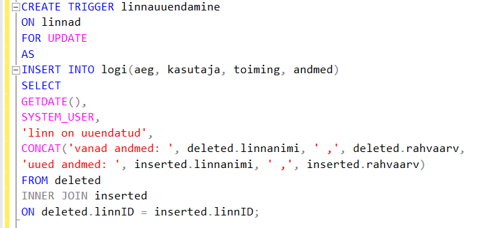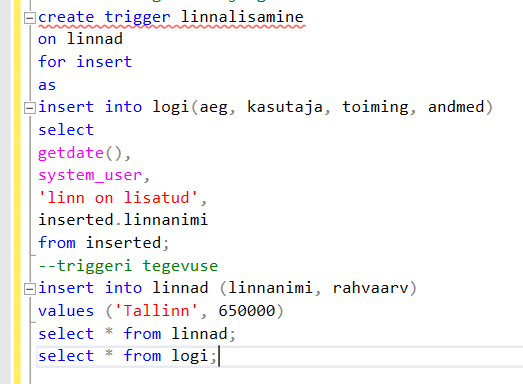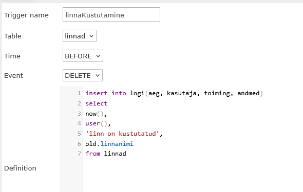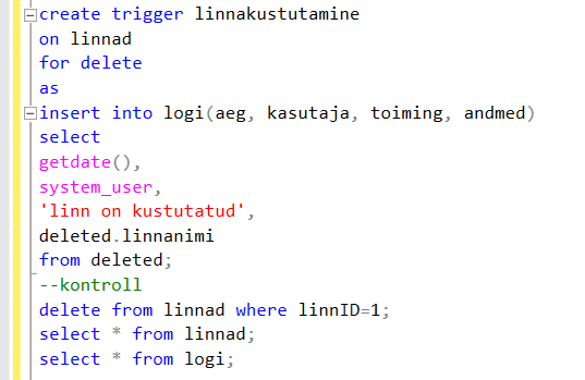 Triger (päästik) – protsess, mille abil tema sisse kirjutatud tegevused (INSERT, DELETE, UPDATE) automaatselt käivitatakse
